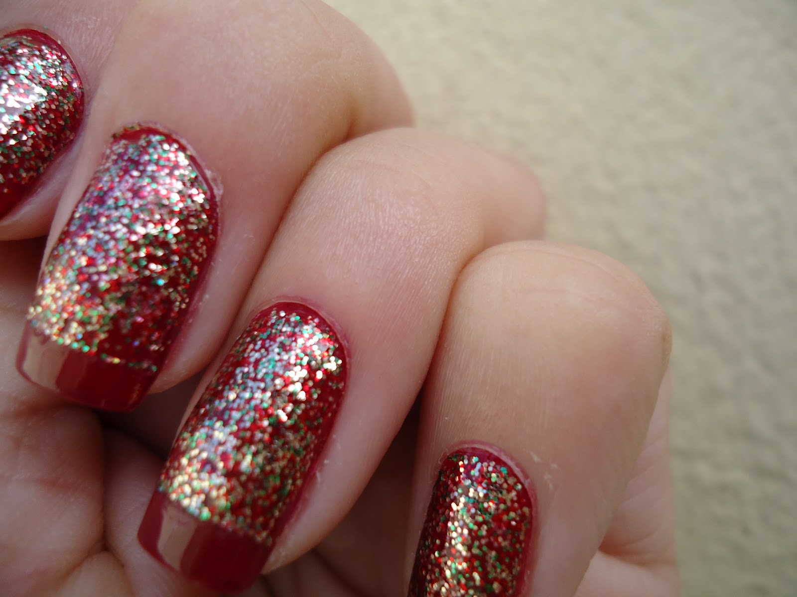 Eu estava com o vermelho lindo da DIOR que mostrei aqui, ai tive a brilhante ideia (sim sem acento de acordo com o novo acordo ortográfico) de ensolaricar fazendo uma francesa invertida, cobri as pontinhas das unhas com fita crepe e "tasquei" glitter no comprimento da unha e deixei as pontinhas lisas...